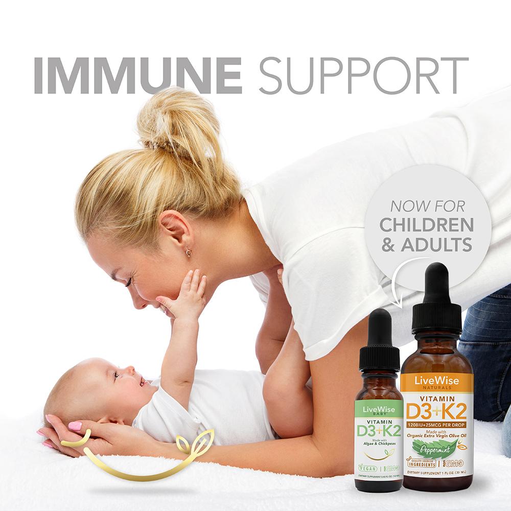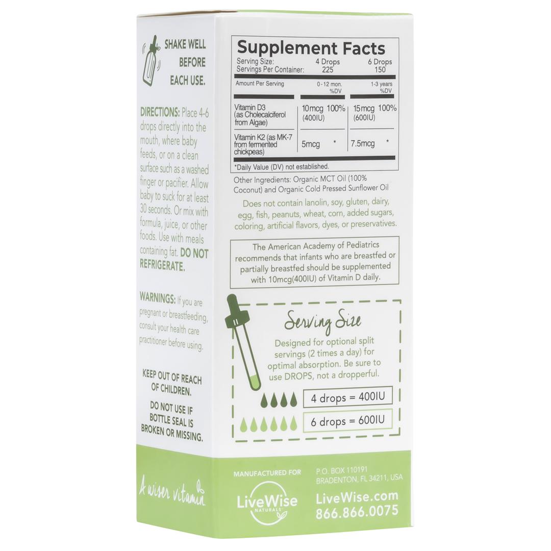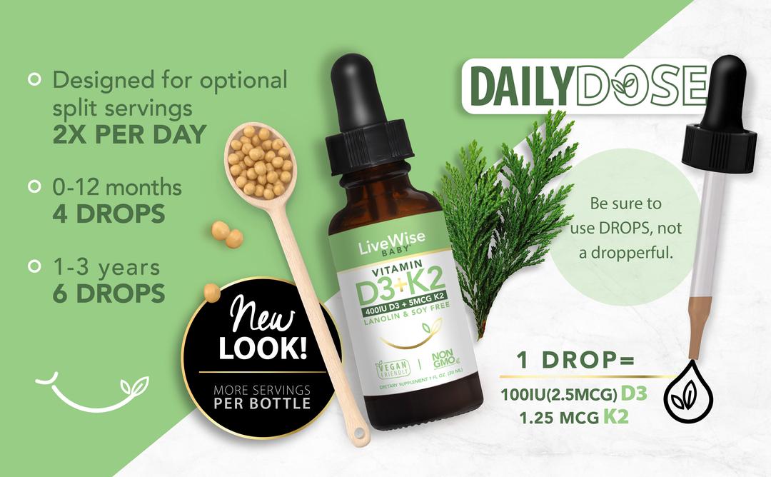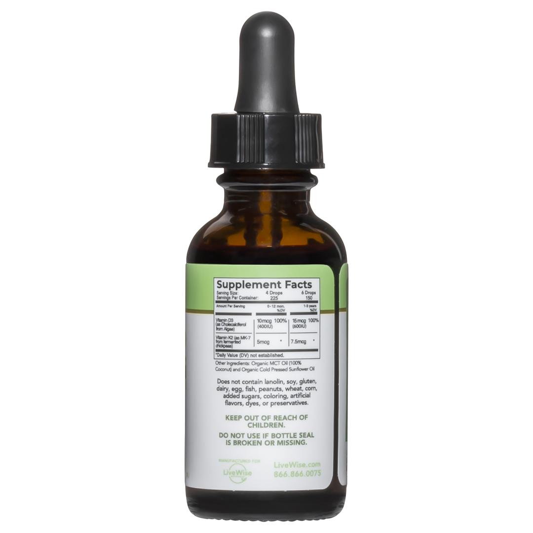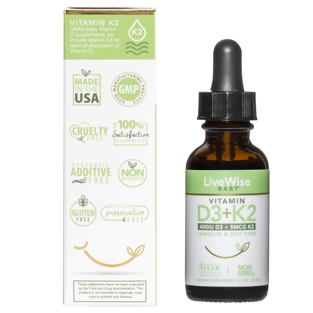 Unlike many Vitamin D supplements for babies, Live Wise Natural’s Baby Vitamin D3+K2 liquid supplement contains not only D3 but also Vitamin K2, which optimizes D3 absorption and prevents calcium buildup and blood clots.