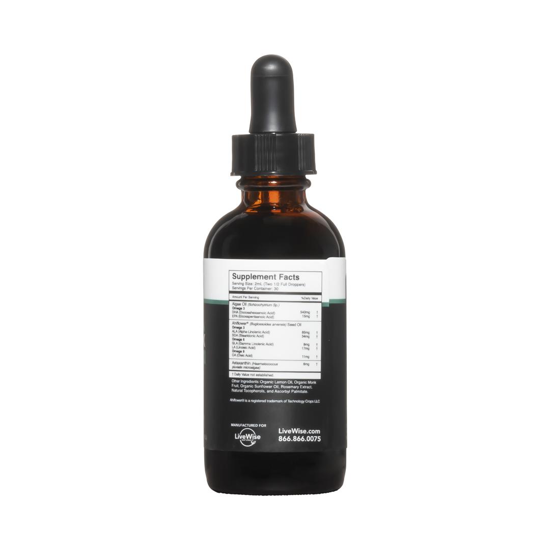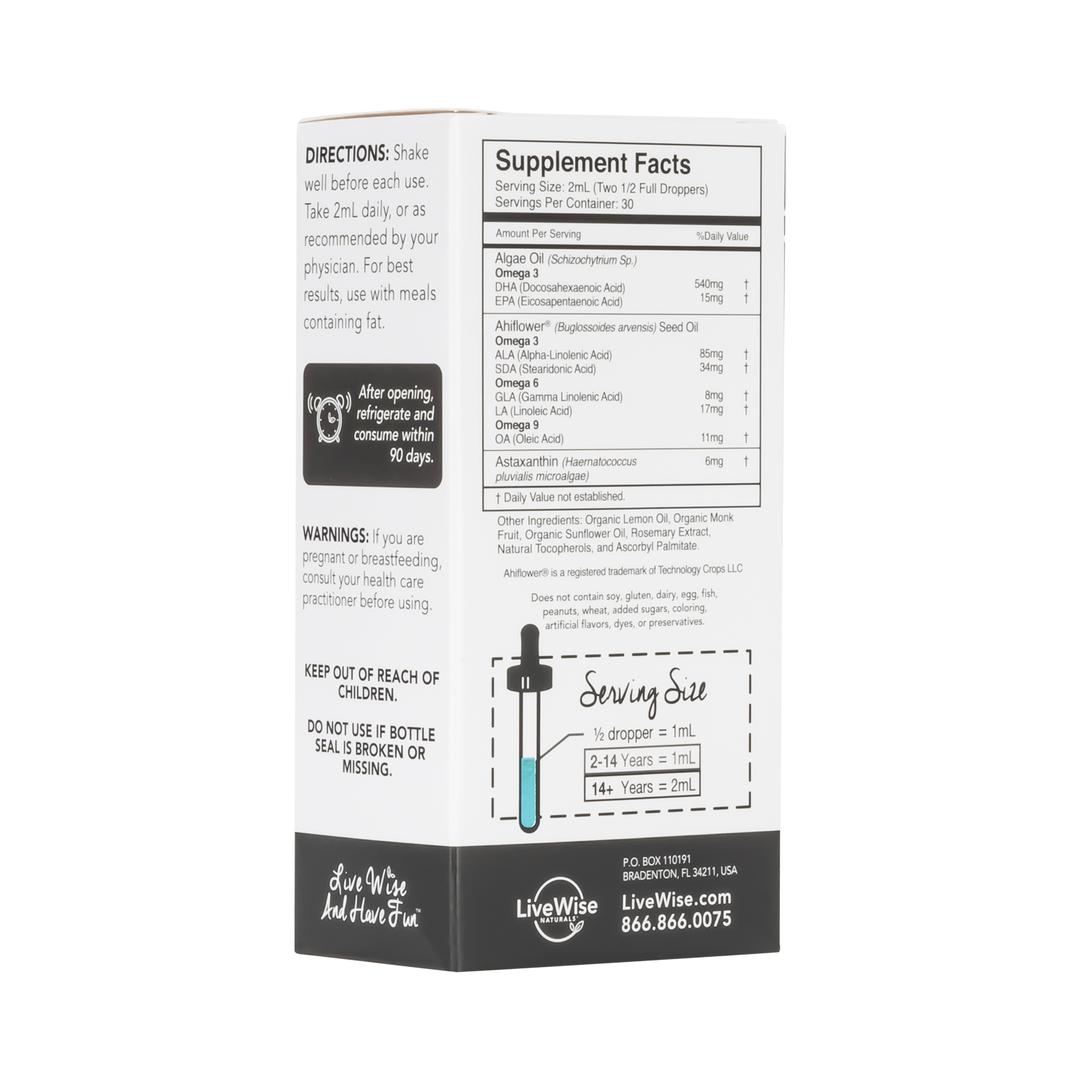 Algae oil (Shizochytrium Sp.), Ahiflower (Buglossoides arvensis) Oil, Astaxanthin, Organic Sunflower Oil, Organic Lemon Oil ( Lemon version only), Monk Fruit Extract, Rosemary Extract, Natural Tocopherols, and Ascorbyl Palmitate