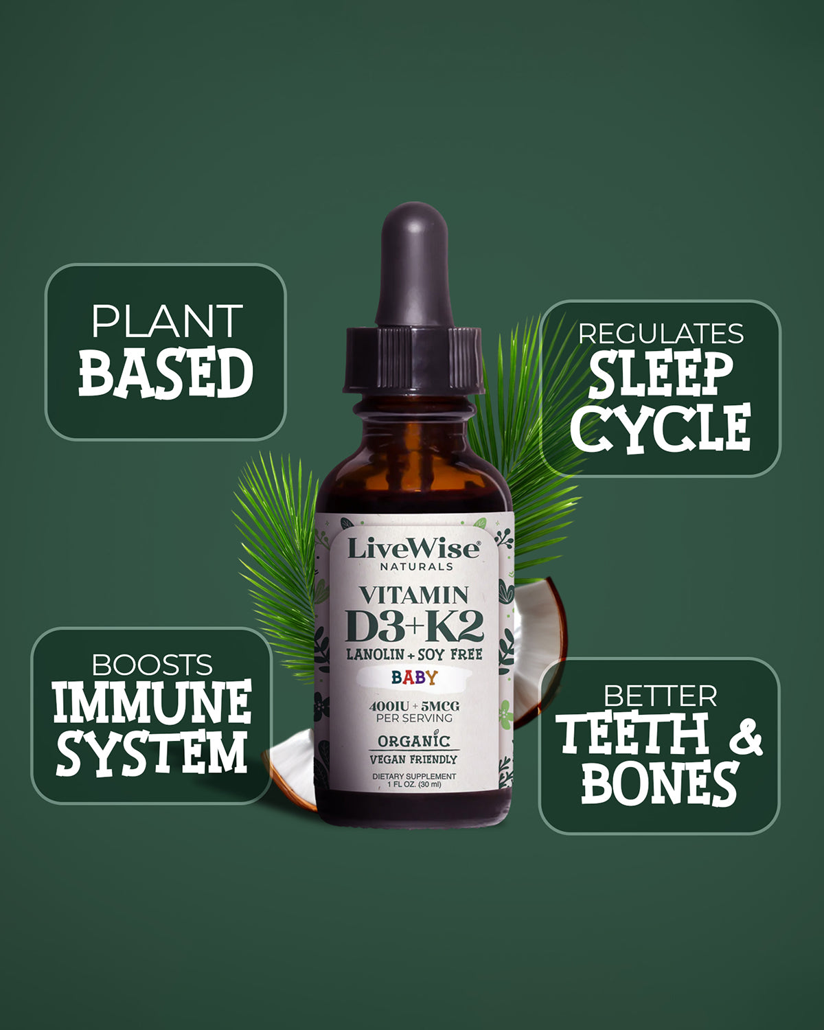 Our USDA Organic liquid formula provides gentle, plant-based vitamin D3 from pine extract, paired with soy-free K2 to support early growth and development. Designed for infants and toddlers, this formula builds a healthy foundation for bones, teeth, and immune function — without lanolin or soy.