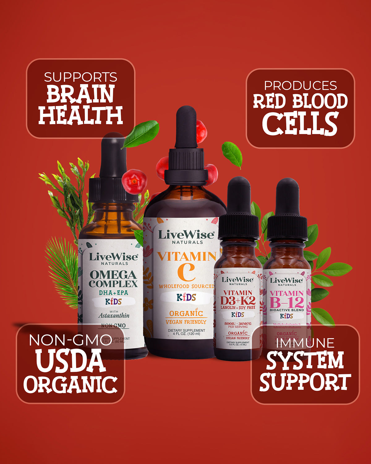 Live Wise Juniors – Complete Kids’ Vitamin Bundle with D3+K2, B12 , C & Omega-3 Drops (SHIPS AFTER 1/27/2026)